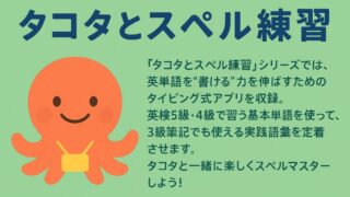 英単語スペル練習|タコタと一緒にスペルマスター! タコタといっしょに、英単語を「読める」から「書ける」に! 英検5級・4級で習う単語を中心に、3級筆記でも使える“よく出る語”を厳選。 音声つき・誤字拒否型スペル練習で、正しい綴りを楽しくマス…