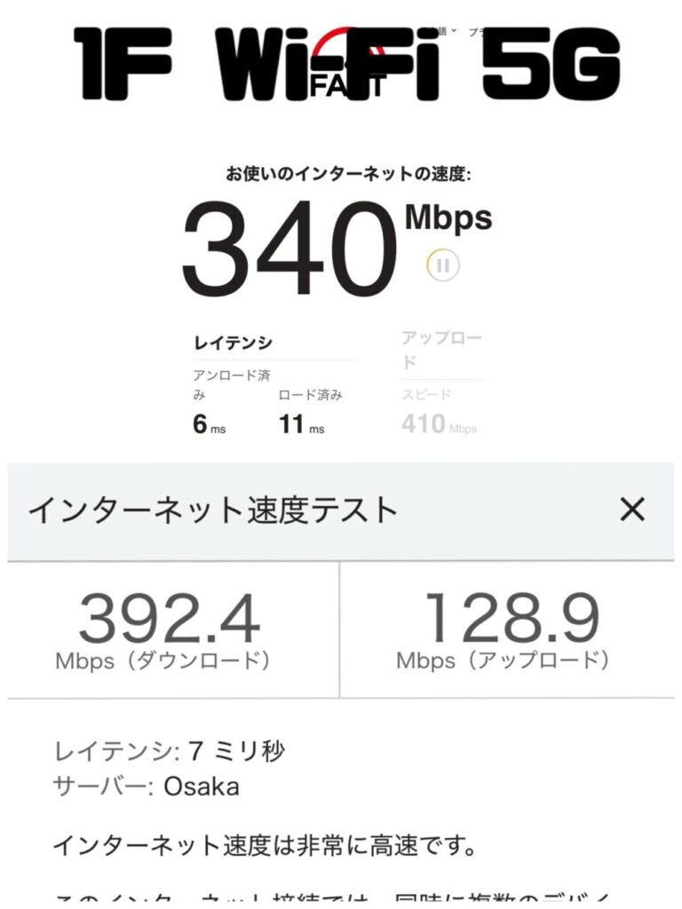 | 1階(親機) | Wi-Fi | 5GHz | 392Mbps | 128Mbps | 7ms | ◎ 爆速で安定 |