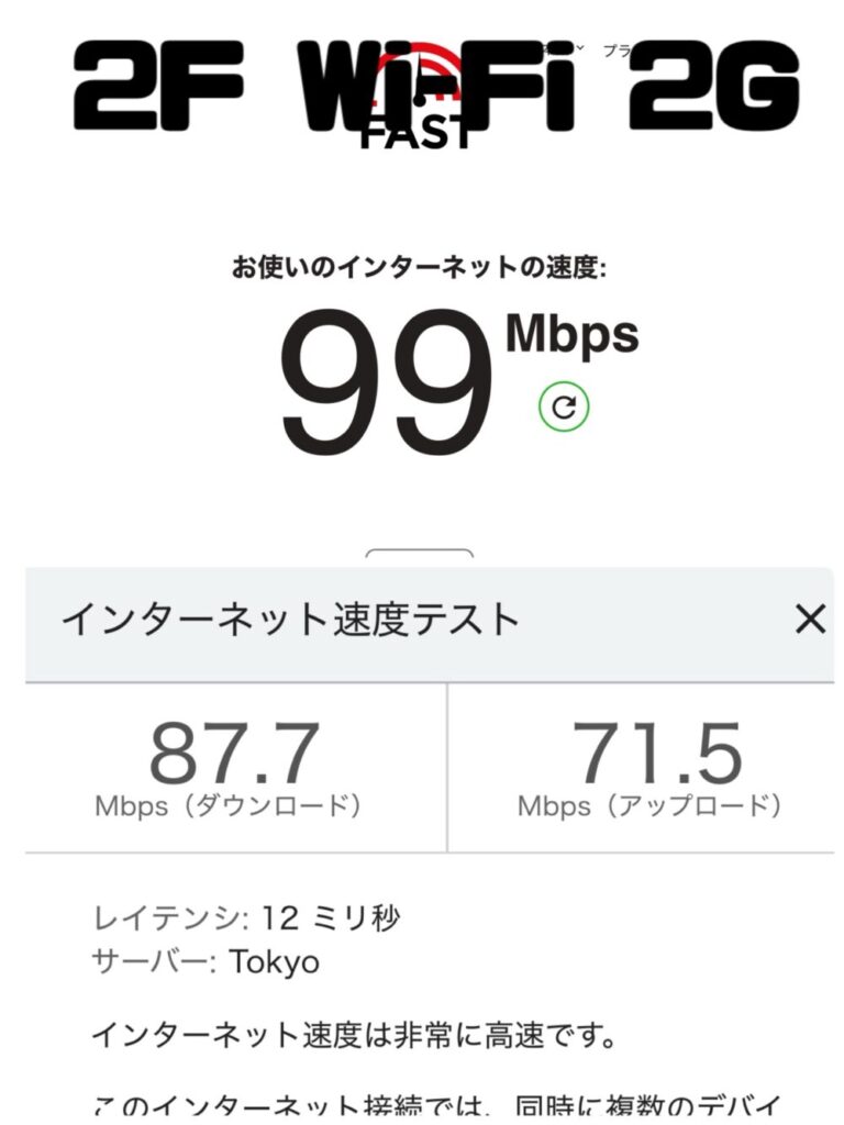 | 2階(Wi-Fiのみ) | Wi-Fi | 2.4GHz | 87Mbps | 71Mbps | 12ms | × ゲームには厳しい |