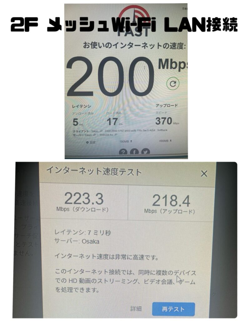 | 2階(メッシュ+LAN直結) | 有線 | LAN | 200〜220Mbps | 218〜370Mbps | 5〜7ms | 💯 理想的な安定感 |