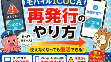 🚃 通学・定期券ガイド モバイルICOCAの再発行方法|使えなくなった時の復旧手順まとめ モバイルICOCAが急に使えなくなって困っていませんか?・機種変更したら使えなくなった・スマホを初期化してしまった・故障してしまったそんなときでも、再発行手続きをすれば元に戻すことができます。ただし、やり方を間違えると復旧できないケースもあ... 2026.04.22 🚃 通学・定期券ガイド