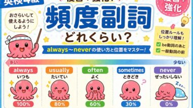 前にやった副詞、覚えてる?🐙✨👉 always(いつも)👉 sometimes(ときどき)今回はそれをもう一回整理して、ちゃんと使えるようにするよ!🧠 頻度副詞(おさらい)always(いつも)usually(たいてい)often(よく)s...