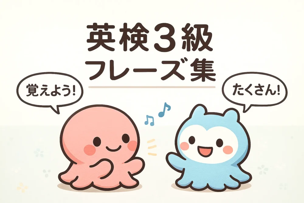 🐙 タコタの英語レッスン|英検3級シリーズまとめ X Facebook コピー 2025.12.04 🐙 タコタの英語レッスン|英検3級シリーズまとめ 英検3級に絶対必要な表現だけをタコタ&コミィの会話で、やさしく楽しく覚えるシリーズ🎓💙 会話形式だから、暗記ではなく「自然に使える英語」が身につくよ。 英作文・面接・リスニングにも全部つながる内容だけを厳選! 🐙 英検3級|25フレーズ完全版 英検3級の「最低限おさえるべきフレーズ」だけを25個にまとめた完全版。 会話で覚えるからスッと頭に入る🌟 ▶ 開く 🐙 英検3級|意見・理由フレーズ I think/because/The reason is that など、英作文・面接で必須の24フレーズ。 タコタの会話で自然に使えるようになるよ💡 ▶ 開く ※ 今後「比較級」「疑問文まとめ」「手紙表現まとめ」など追加予定 ✨