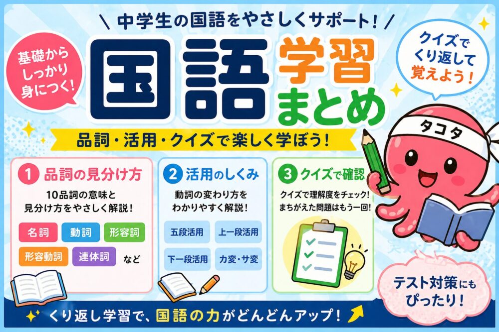 品詞・活用・クイズで、国語の基礎を楽しく確認できるページです。